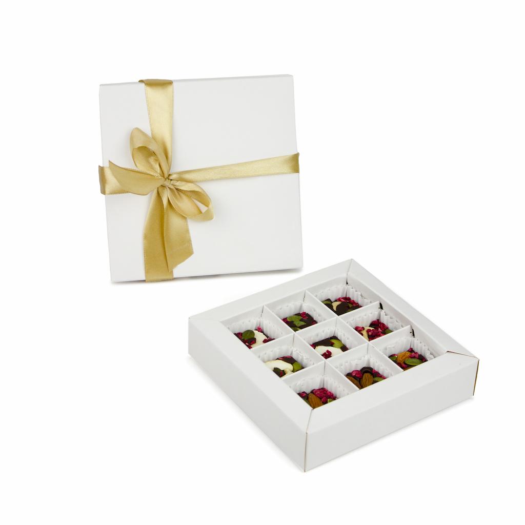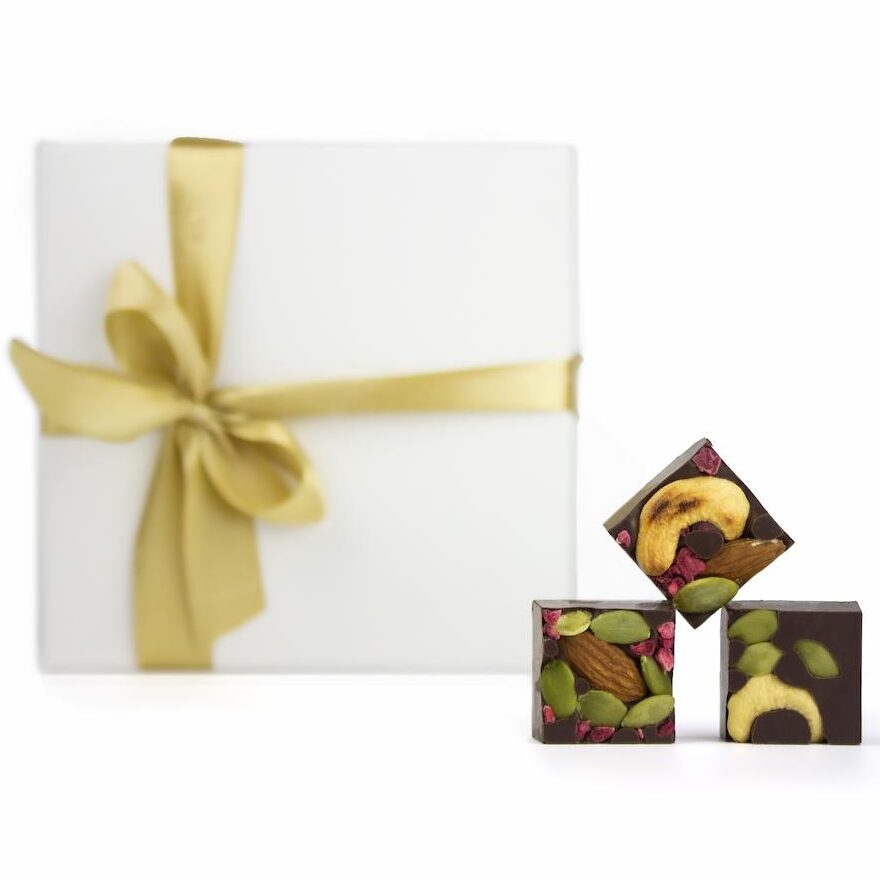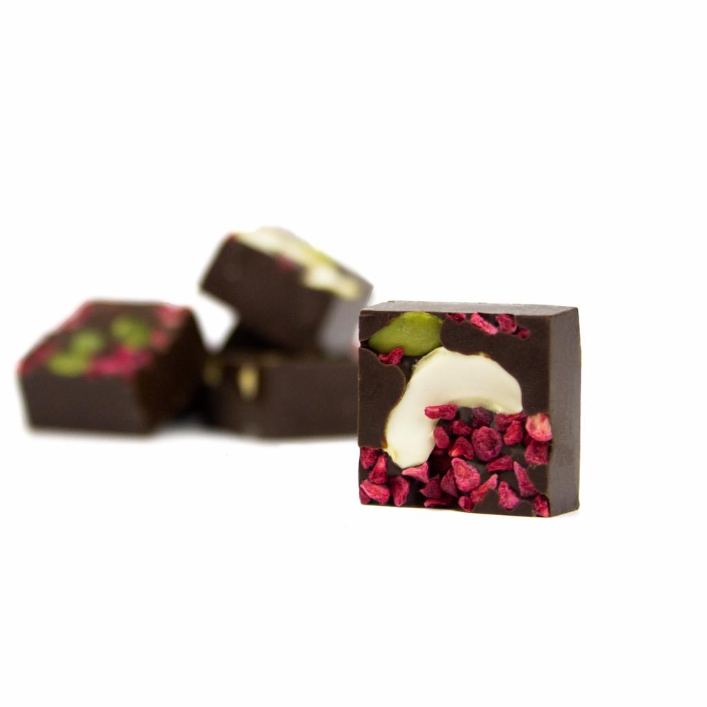 Gaminame iš kokybiško juodojo belgiško šokolado. Šiems šokolado kubeliams grožio bei žavesio suteikia papuošimai ir pagardinimai su lengvai paskrudintais anakardžių, lazdynų ir migdolų riešutais, liofilizuotomis avietėmis bei moliūgų sėklomis.